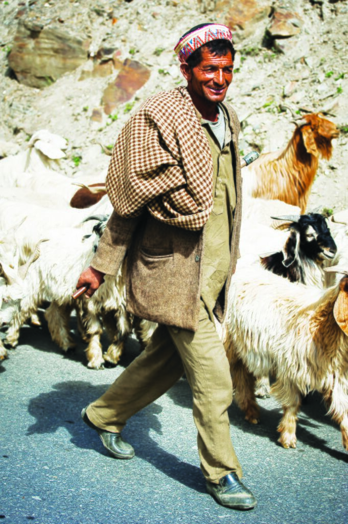 A high-spirited song ‘Jeena Kangre da’ (The life of Kangra valley) expressly celebrates the life of the Gaddis in all its simplicity and contentment. Sung by the Kangra natives in appreciation of their pastoralist counterparts from Chamba (fondly referred to as ‘mittar’ or friends), the lyrics evoke the cool winds, pine trees and mountain slopes where Gaddis and Gaddans (female Gaddis) sing to each other. The lines ‘Dhann Gaddiyaan de/dhaaran ch chugde’ (The wealth of the Gaddis/graze the slopes) are telling, because ‘dhann’ here refers to the flock of sheep accompanying the shepherds. Akin to the Hindi word ‘dhan’, meaning ‘wealth’, the flocks are literally considered the greatest ‘capital’ of the Gaddis, walking vast distances with them in hundreds and thousands, conjuring a picture of grace and perseverance. Very often, Gaddis pick up a lamb or two and carry them in the ‘khokh’ (pocket) of their ‘cholas’ (tunics), protecting them as their children.
