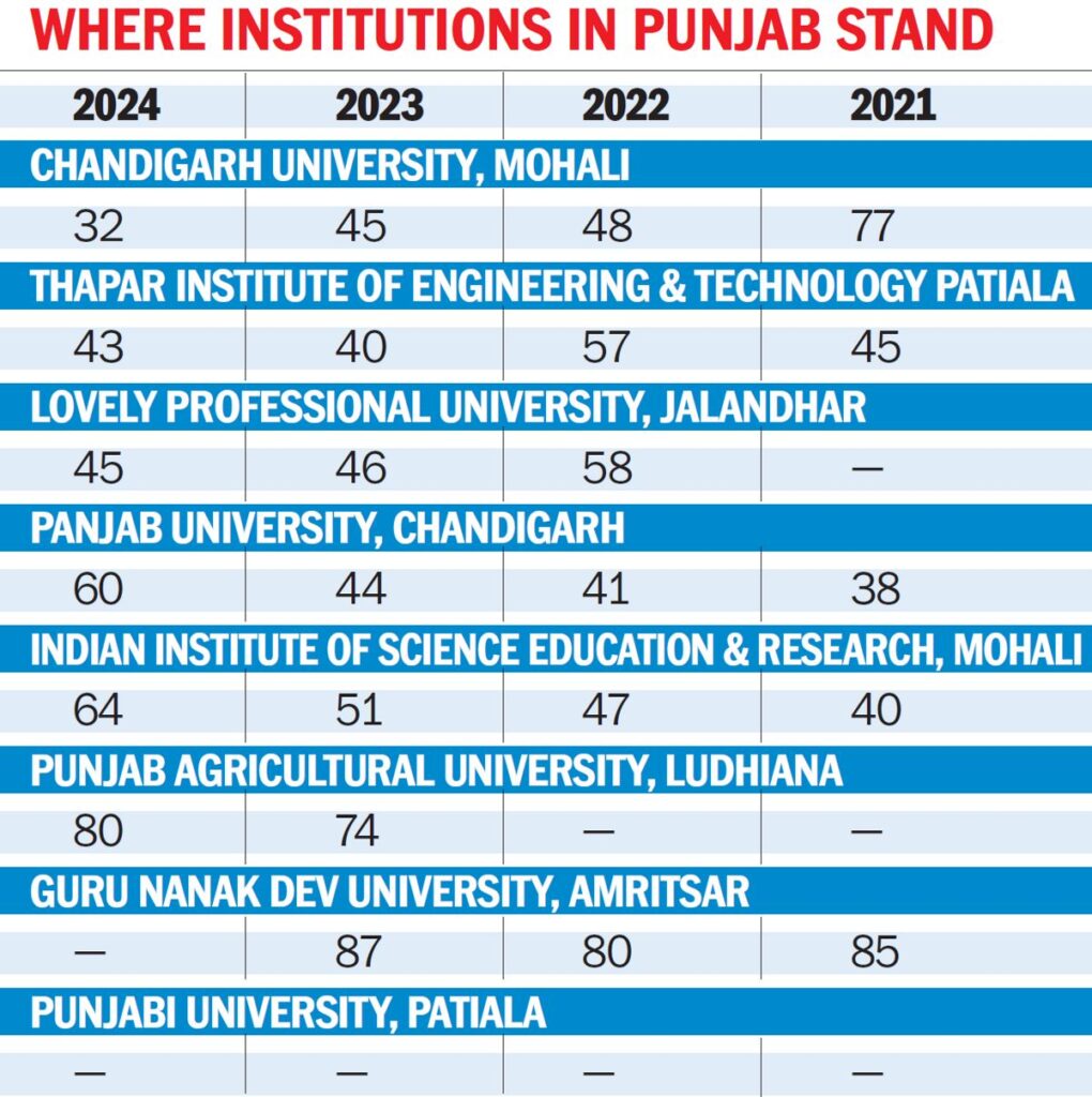 The oldest university of the region, Panjab University (PU) in Chandigarh, is ranked 60th, down from 44 last year. It was ranked 38 in 2021 and 41 in 2022. The university is funded in the 60:40 per cent ratio by the Centre and the Punjab government.