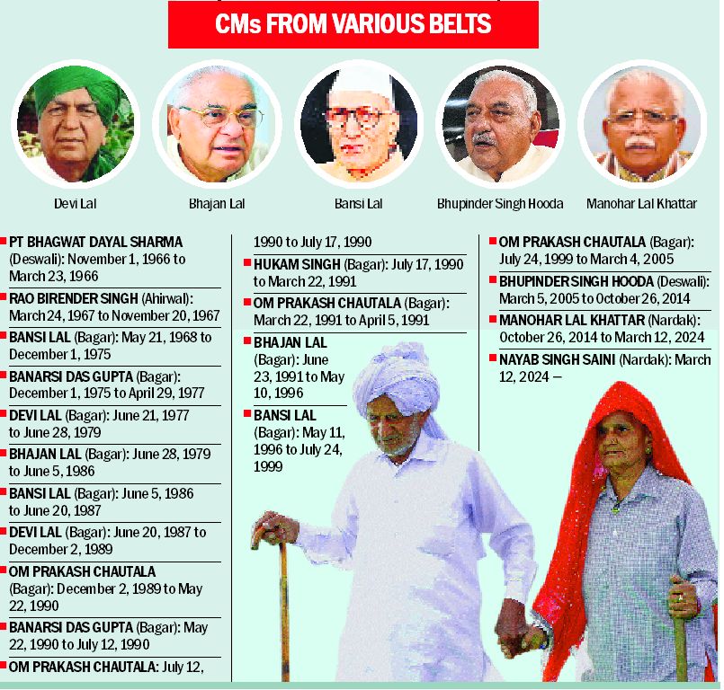 Political scientist Prof Kushal Pal maintains that the regional identities have strengthened over the years, with a few exceptions. “Political leaders nurture and strengthen their own base. The CM’s home segment always emerges as the power centre. In Haryana, the CMs have been mostly from Hisar and Rohtak. So, the intensity of political assertion here is more,” he says.